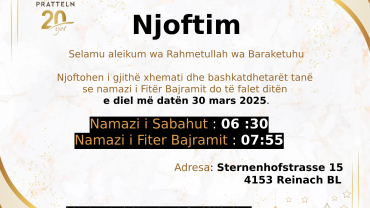 Njoftim Selamu aleikum wa Rahmetullah wa Baraketuhu Njoftohen i gjithë xhemati dhe bashkatdhetarë tanë se namazi i Fitër Bajramit do të falet ditën e diel më datën 30 mars 2025. Namazi i Sabahut : 06 :30 Namazi i Fiter Bajramit : 07 :55