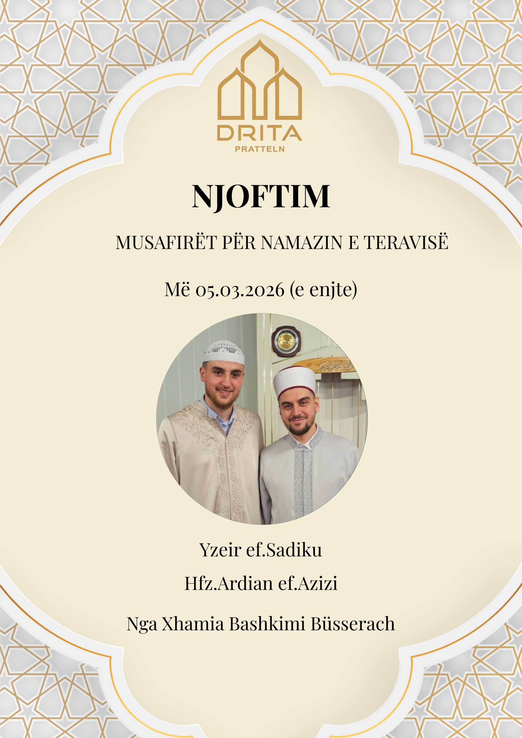 Ju ftojmë me kënaqësi të merrni pjesë në një mbrëmje të veçantë shpirtërore me rastin e namazit të Teravive.